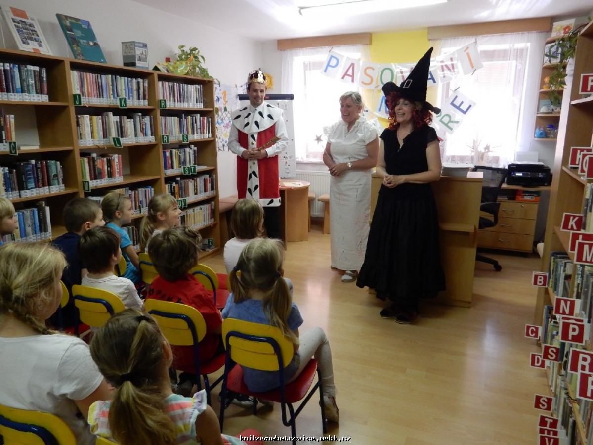 Své čtenářské dovednosti předvedli žáci první třídy, aby mohli být pasováni králem Abecedníkem I.na čtenáře knihovny.